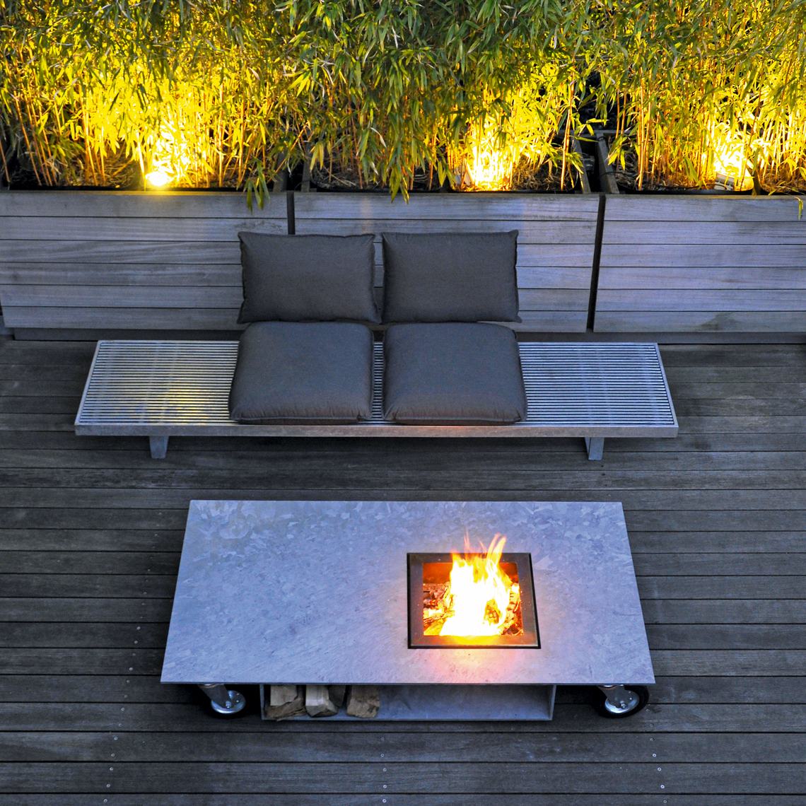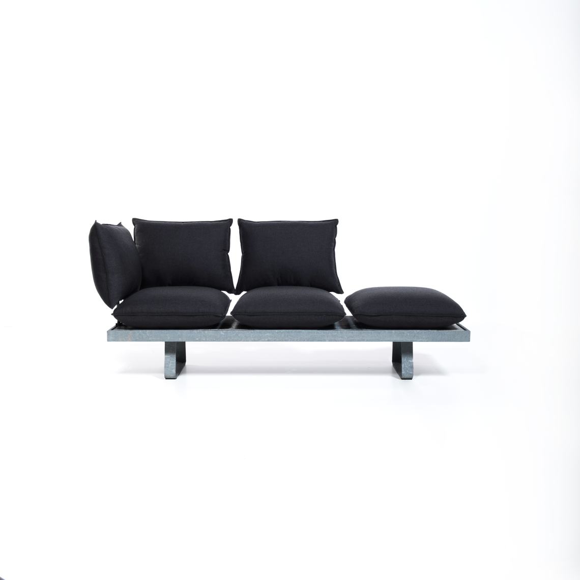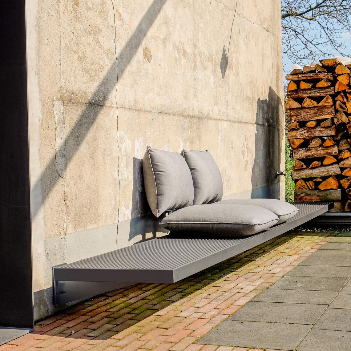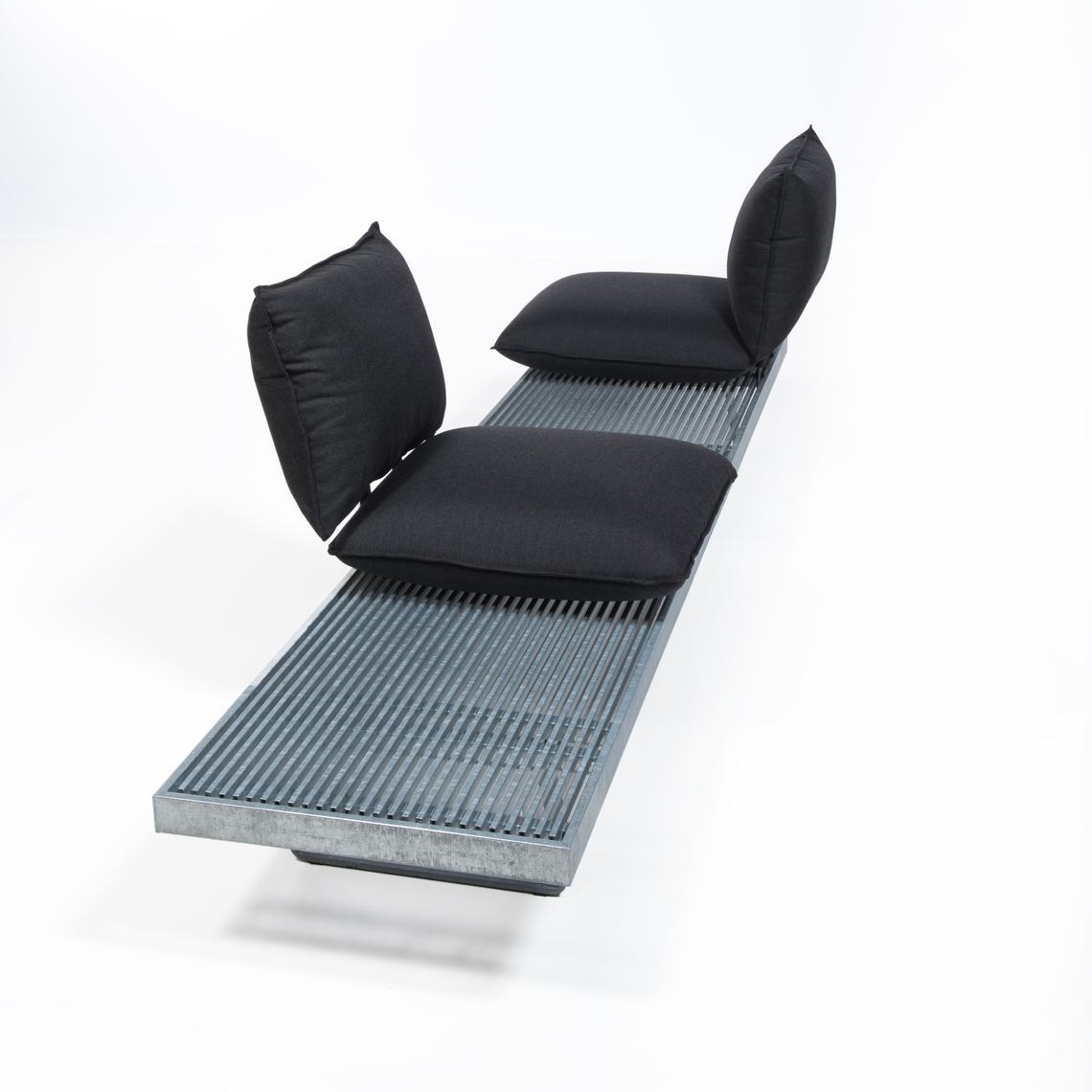 De weerbestendige kussens steek je door middel van een stalen frame tussen de profielen van de bank, op iedere gewenste plek. Zo maak je óf een aaneengesloten bank, óf losse zitjes met tafels daartussen.
